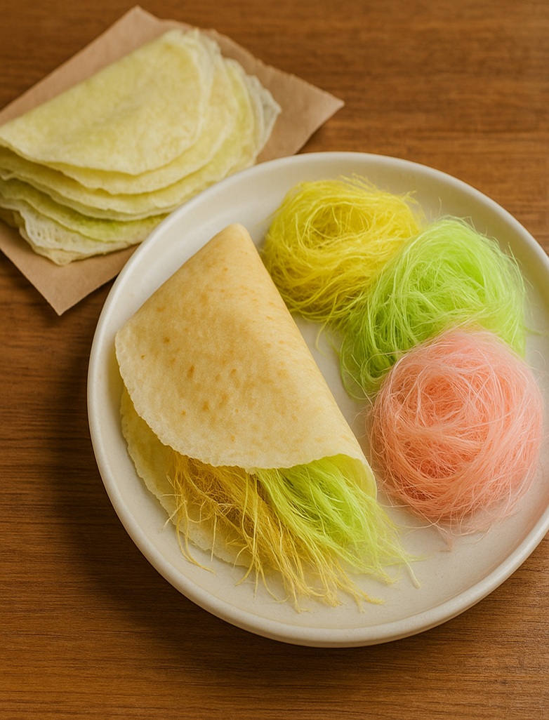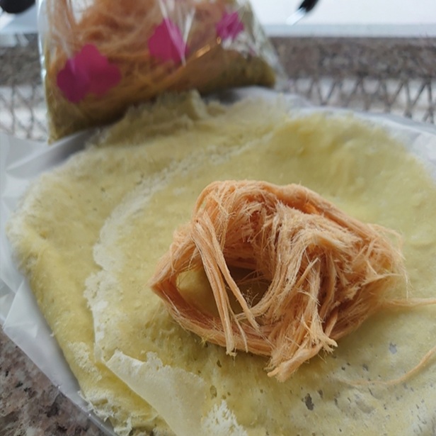 ロティ・サイマイ(โรตีสายไหม)は、タイの伝統的なお菓子です。 小麦粉で作られたクレープのような生地に、カラフルな綿菓子のような細い砂糖の糸を包んで食べます。 甘くて香ばしい味わいが特徴で、特にアユタヤ地方で有名です。 屋台やお祭りなどでよく見かける人気のスイーツです。