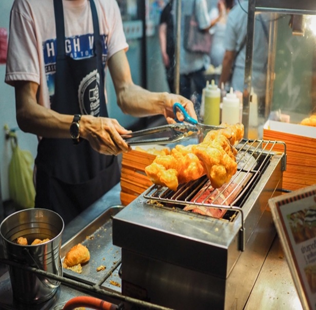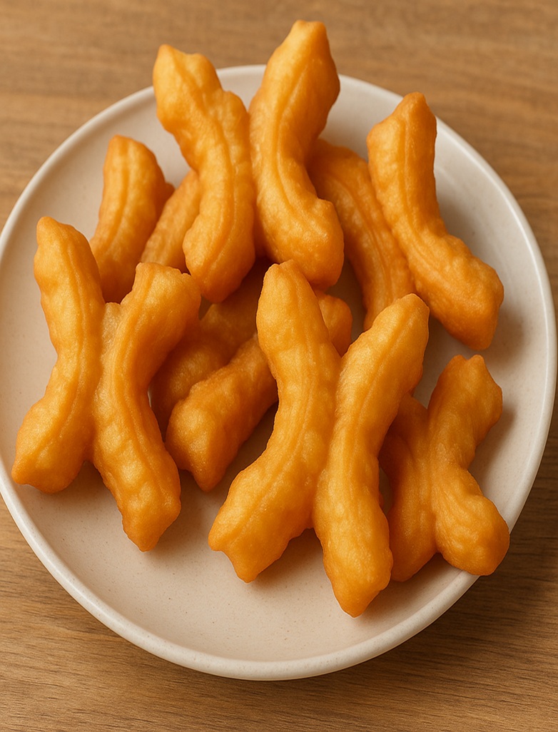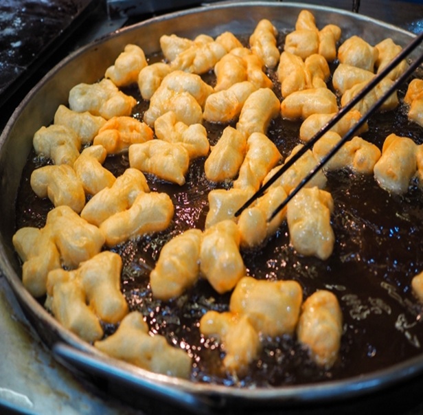 パートンコー(ปาท่องโก๋)は、タイで人気のある揚げパンです。 見た目は2本の小さなパンがくっついた形で、外はカリッと、中はふんわりしています。 朝食としてよく食べられ、豆乳やお粥と一緒に楽しむのが一般的です。 甘い練乳やカスタードクリームをつけて食べることもあります。 タイの屋台や市場で簡単に見つけることができます。