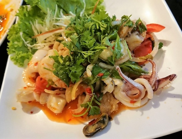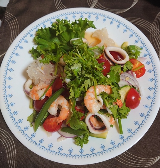 ヤムタレー(ยำทะเล)は、シーフードを使ったピリ辛サラダです。 エビ、イカ、貝などの新鮮な海の幸が使われています。 ナンプラー、ライム、唐辛子、ハーブなどを混ぜた特製ドレッシングで和えられています。 酸味・辛味・塩味のバランスが絶妙で、とても食欲をそそります。 冷たいままでも美味しく食べられる一品です。