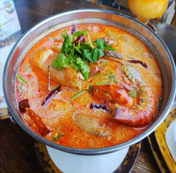 トムヤムクン(ต้มยำกุ้ง)は、タイを代表するスパイシーで酸味のあるスープです。 主な材料にはエビ、レモングラス、カフィアライムの葉、ガランガル、チリ、ナンプラーなどが使われます。 ピリッとした辛さと酸味、そしてハーブの香りが特徴で、特にエビの旨味が際立ちます。 タイではご飯と一緒に食べることが多く、世界中で人気のあるタイ料理の一つです。