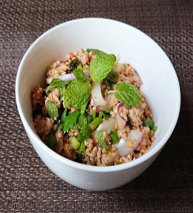 ラープ・ガイ(ลาบไก่)は、タイのイサーン地方(東北部)を代表する伝統的な料理です。 主な材料は鶏ひき肉、炒った米粉、ライムジュース、ナンプラー、そして唐辛子で、ハーブとしてミントやパクチーも使われます。 ピリ辛でさっぱりとした味わいが特徴で、ご飯と一緒に食べられることが多いです。 タイの屋台や家庭で広く楽しまれており、ビールとの相性も抜群です。