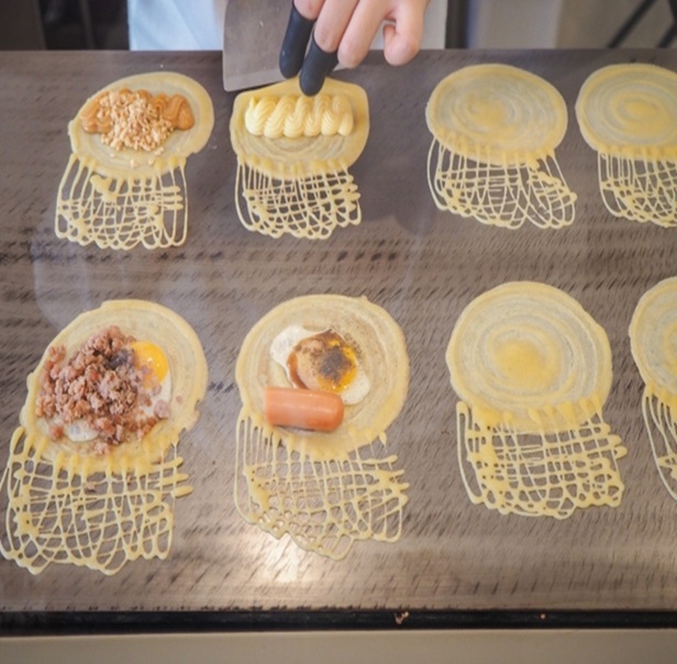 カノム・トーキョー(ขนมโตเกียว)は、タイのストリートフードの一つで、小さなクレープのような形をしています。 外側は薄くてパリッとした生地で、中には甘いクリームやカスタード、またはソーセージや卵などのしょっぱい具材が入っています。 見た目は日本の名前ですが、日本とは関係なく、タイ独自のお菓子です。 学校の前や市場などでよく見かけ、子供から大人まで人気があります。