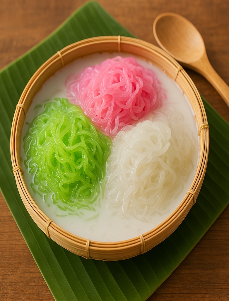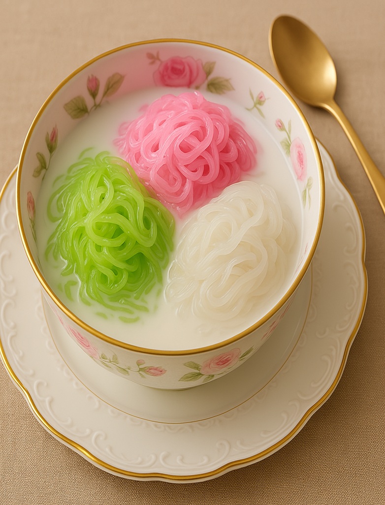 サリム(สลิ่ม)は、タイの伝統的なデザートの一つです。 色とりどりの細い寒天のような麺を、甘いココナッツミルクと一緒に氷とともに楽しむ冷たいスイーツです。 通常、ピンクや緑などのカラフルな色が使われており、見た目にも涼しげで可愛らしいです。 暑い季節にぴったりのデザートとして、タイの屋台や家庭で広く親しまれています。 シンプルながらもココナッツの風味と甘さが魅力です。
