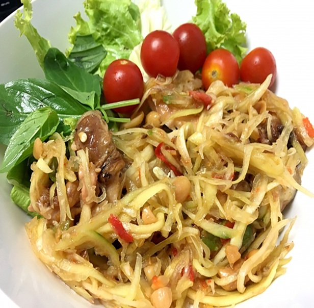 ソムタム(ส้มตำ)は、タイの代表的なサラダの一つで、青パパイヤを主な材料としています。