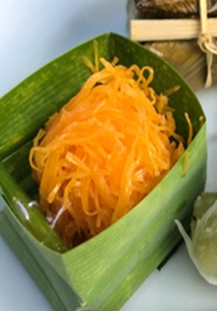 フォイトーン(ฝอยทอง)は、タイの伝統的なデザートの一つで、ポルトガルから伝わったお菓子です。 卵黄と砂糖を煮詰めて糸のように細くしたもので、黄金色が特徴です。 名前の「フォイ(Foi)」はポルトガル語の「糸」を意味し、「ทอง(Thong)」はタイ語で「金」を意味します。 縁起が良いとされ、結婚式やお祝いの場でよく食べられます。 甘くて柔らかい食感が魅力のスイーツです。