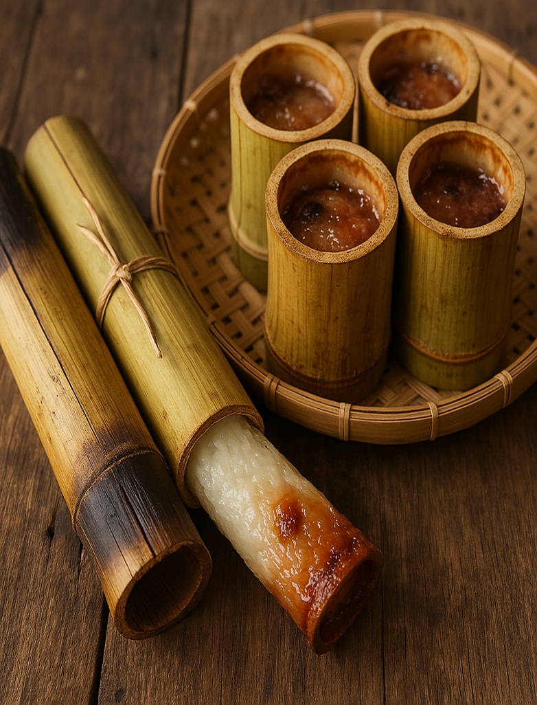 カオラーム(ข้าวหลาม)は、タイの伝統的な食べ物で、特別な行事やお祭りのときによく作られます。 もち米を竹筒に入れ、ココナッツミルクや豆、時にはバナナなどを加えます。 その後、竹筒ごと火で焼いて、中のもち米が蒸し上がるまで加熱します。 竹の香りが染み込んだもち米は、とても風味豊かで美味しいです。