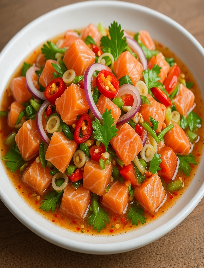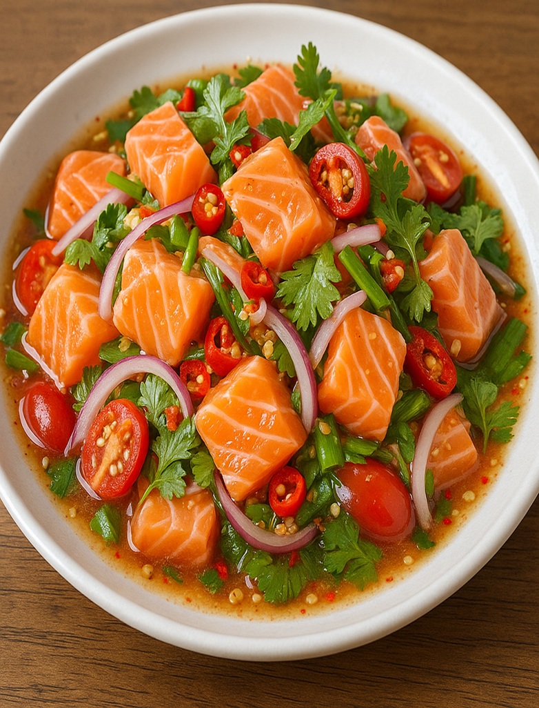 ヤムサーモン(ยำแซลมอน)は、新鮮なサーモンを使ったタイ風のスパイシーサラダです。 唐辛子の辛さ、ライムの酸っぱさ、そしてナンプラーの旨味が合わさった特製のソースで和えています。 ミントなどの爽やかなハーブがたっぷり入っているのも特徴です。 さっぱりとしながらも刺激的な味わいで、多くの人に愛されています。