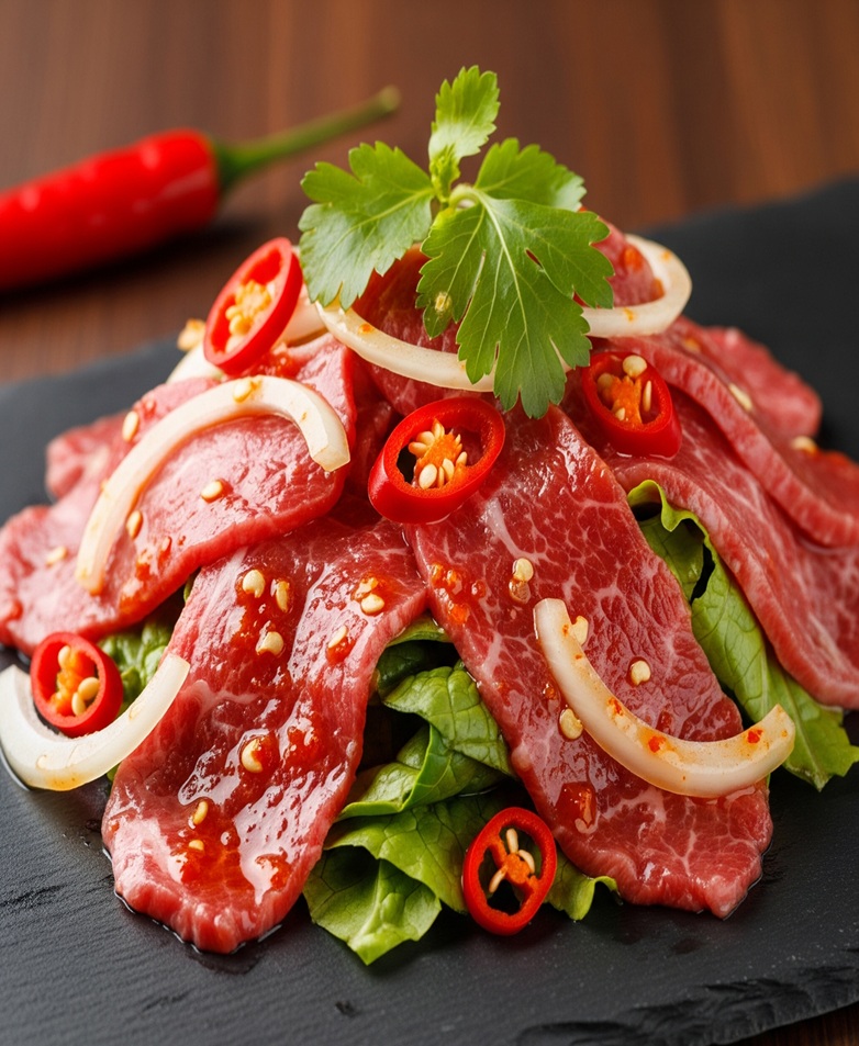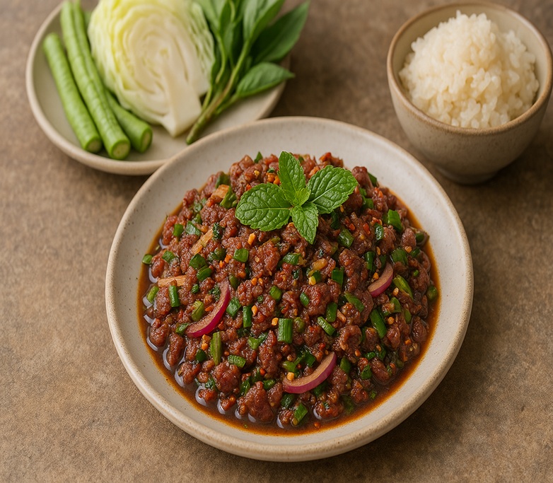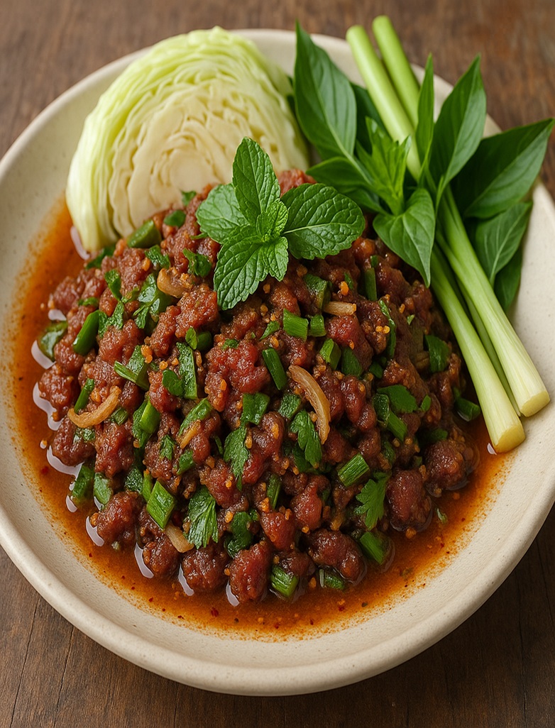ゴイ(ก้อย)は、タイ東北部(イサーン地方)の郷土料理で、生肉のスパイシーサラダです。 牛肉や魚、小エビなどの生の食材を、煎り米粉、唐辛子、ハーブ、ライム果汁で和えたもので、日本のユッケに似ているとも言われます。 爽やかなハーブの香りとスパイシーで酸味のある味わいが特徴です。 通常は生で食べられますが、「ゴイクア」と呼ばれる炒めたバージョンもあります。