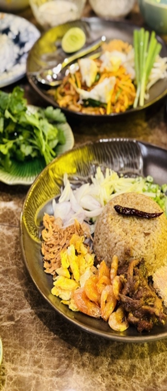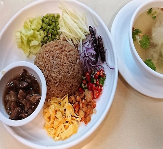 カオクルックカピ(ข้าวคลุกกะปิ)は、エビの発酵ペースト(カピ)を混ぜたご飯です。 香ばしい風味と独特の塩味が特徴で、さまざまな具材と一緒に提供されます。 一般的なトッピングには、甘辛く炒めた豚肉、千切りマンゴー、卵焼き、赤玉ねぎ、青唐辛子、キュウリなどがあります。 これらの具材をよく混ぜて食べることで、甘味・塩味・酸味・辛味のバランスが楽しめます。 タイの屋台や家庭料理として人気のある一品です。