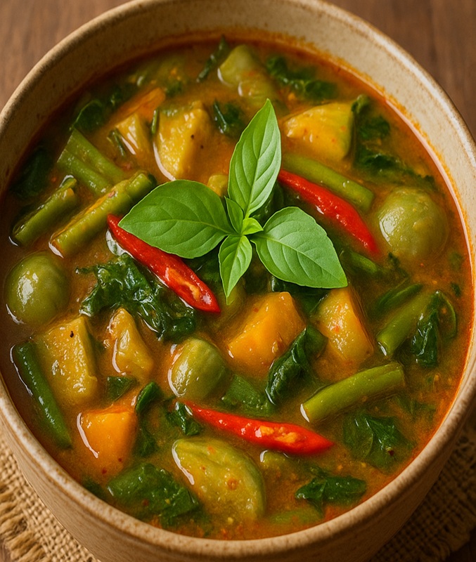ゲーン・リアン(แกงเลียง)は、タイの伝統的な家庭料理で、野菜がたっぷりと入ったハーブの香りが特徴的なスープです。 カボチャ、ヘチマ、きのこなど様々な野菜を、エビ味噌(カピ)や干しエビ、コショウなどで作ったペーストで煮込みます。 唐辛子ではなくコショウを主な辛味としているため、ピリッとした独特の風味があります。 最後にレモンバジルを加えることで、爽やかな香りが引き立ち、栄養満点でヘルシーな一品として親しまれています。