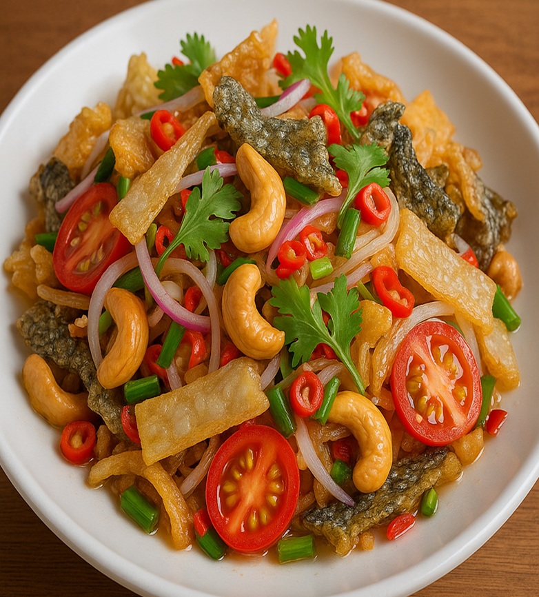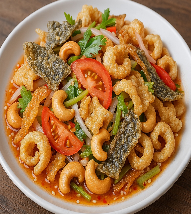 ヤム・サーム・クローブ(ยำสามกรอบ)は、タイのスパイシーなサラダ料理の一つです。 名前の「サーム・クローブ」は「三つのカリカリ食感」という意味で、主に揚げた豚の皮、カリカリのイカ、そしてカシューナッツが使われます。 唐辛子、ライム果汁、ナンプラーなどを使ったピリ辛で酸味のあるドレッシングが特徴です。 サクサクとした食感と、味のバランスが絶妙な人気の一品です。