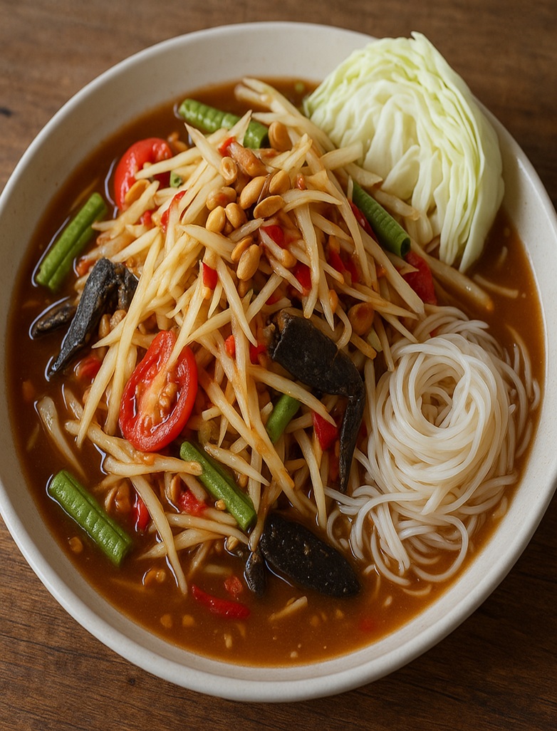 タムスア(ตำซั่ว)は、タイの東北地方(イサーン地方)の有名な料理で、スパイシーなパパイヤサラダの一種です。 これは、ソムタムに「カノムチーン」と呼ばれるタイの発酵米麺を和えたものです。 発酵魚のソース(プラーラー)で風味付けされ、唐辛子の辛さとライムの酸味が効いた、非常に風味豊かで刺激的な味わいが特徴です。 麺が加わることで、通常のソムタムよりも食べ応えのある一品となっています。