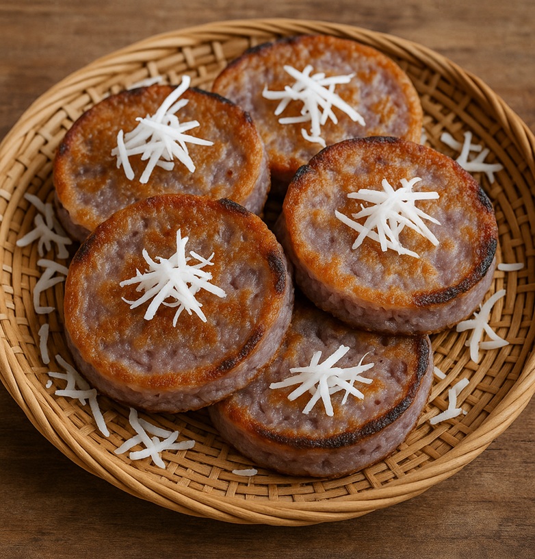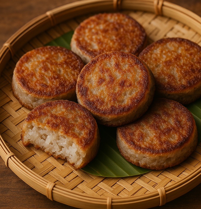カノム・バービン(ขนมบ้าบิ่น)は、もち米粉と削ったココナッツから作られるタイの伝統的なお菓子です。 甘くて香ばしい味わいが特徴で、外はカリッと、中はもっちりとしています。 通常は小さく丸い形に成形され、鉄板で焼かれます。 ココナッツの香りが広がる素朴で優しい味のお菓子です。 お茶やコーヒーと一緒に楽しむのにぴったりです。