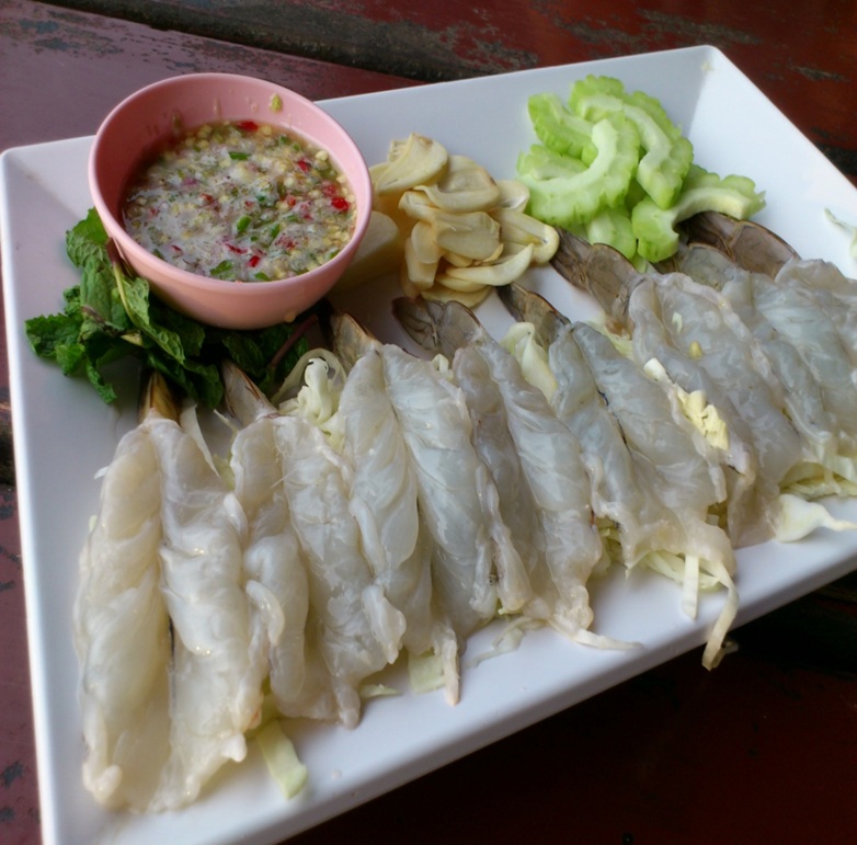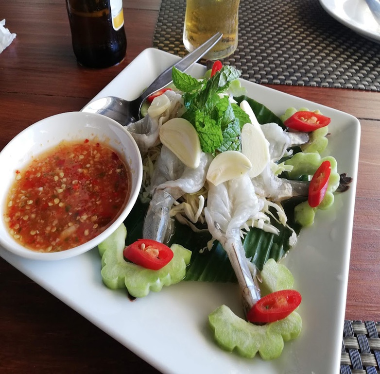 クンチェーナンプラー(กุ้งแช่น้ำปลา)は、新鮮な生の海老を使ったタイの人気料理です。 タイ語で「クン」はエビ、「チェー」は漬ける、「ナンプラー」は魚醤を意味します。 この料理は、生の海老をナンプラー、ライム、唐辛子、ニンニクなどで作られた、酸味と辛味の効いた特製ソースに漬けて食べます。 ぷりぷりとした海老の食感と、スパイシーで爽やかなソースの組み合わせが絶妙で、お酒のおつまみとしてもよく合います。 日本の海老の刺身やカルパッチョに似た料理と紹介されることもあります。