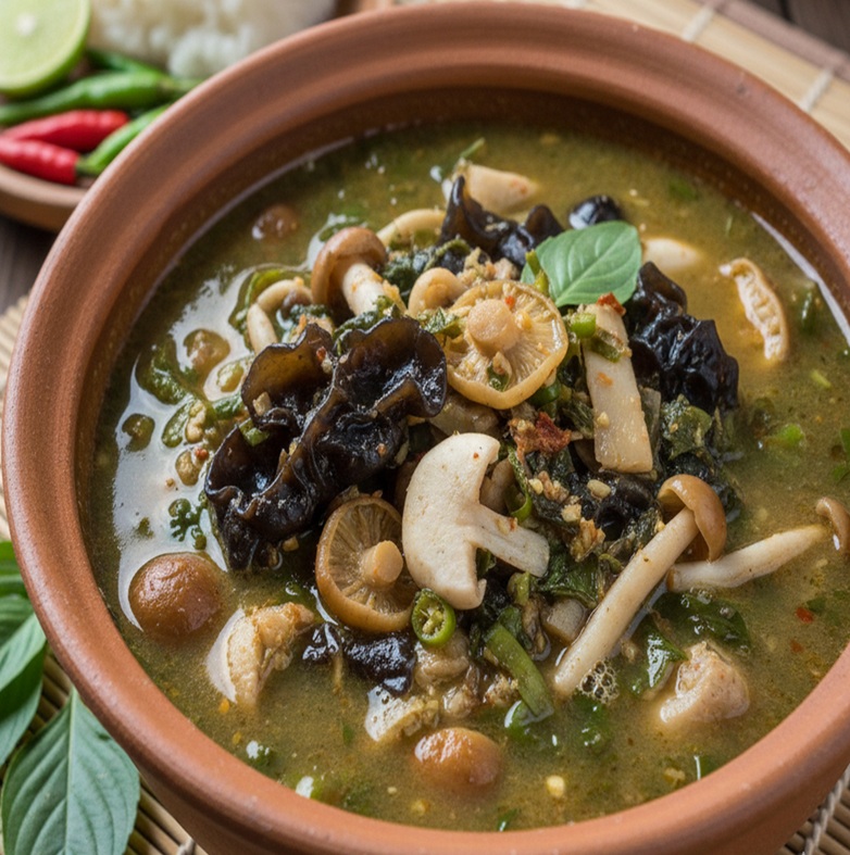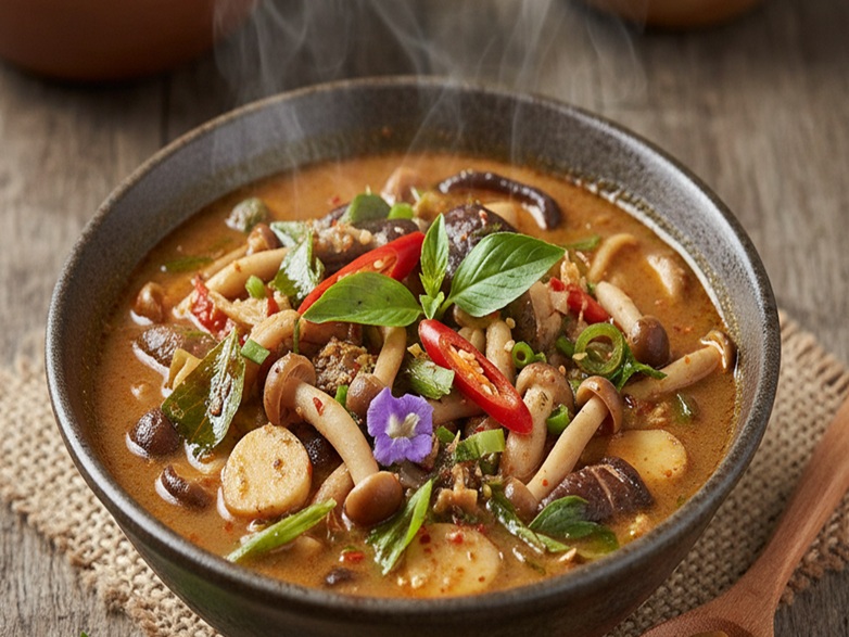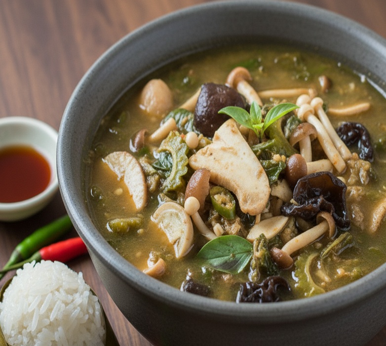 季節のキノコの他に、カボチャやチャオム(アカシアの若芽)などの野菜も入り、発酵魚のソース「プラーラー」(ปลาร้า)で旨味を加えることも多い、香りの良いヘルシーな料理です。