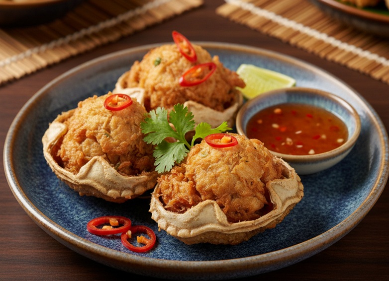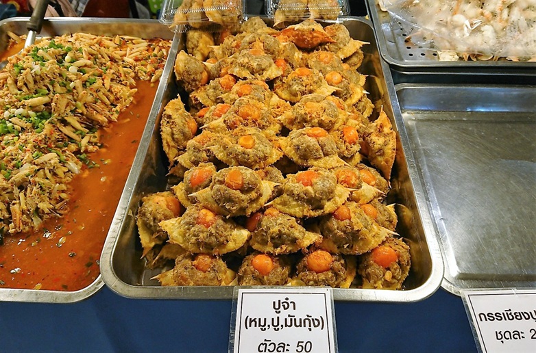 プージャー(ปูจ๋า)は、タイ料理の一品です。 主な材料は、カニの身と豚のひき肉で、これらをニンニク、コショウ、パクチーの根などで風味豊かに味付けします。 味付けした具材をカニの甲羅にぎっしりと詰め込みます。 その後、油で揚げるか、一度蒸してから揚げるのが一般的です。 外側はカリッと香ばしく、中はジューシーで、カニと豚肉の旨味が詰まった美味しい料理です。