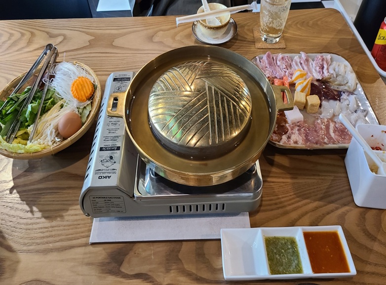 ムーガタ(หมูกะทะ)は、日本の焼肉としゃぶしゃぶを同時に楽しめる、タイで非常に人気のある料理です。 真ん中がドーム状に盛り上がり、その周りがスープの溝になっている独特な形の鍋を使用します。 ドームの部分で豚肉などを焼き、その肉汁が流れ落ちた周りのスープで野菜や麺を煮て食べます。 焼き上がった具材は、唐辛子やニンニクが効いたスパイシーな特製タレにつけて食べるのが一般的です。 安くて美味しいビュッフェ形式のお店が多く、家族や友人と賑やかに食事をする際によく選ばれます。